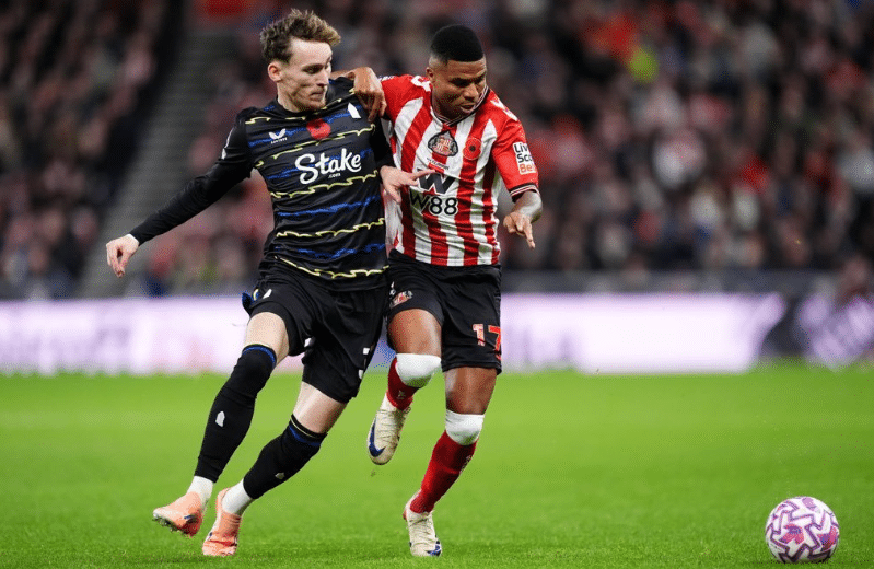 O Sunderland, que vinha desfrutando de um dos inícios mais fortes de uma campanha na primeira divisão em anos, encontrou-se sob pressão. Jack Grealish acertou a trave de longe, antes de Thierno Barry perder uma chance de ouro, cobrando por cima da queima-roupa. Os anfitriões começaram a entrar no jogo antes do intervalo, criando uma série de chances – o chute de Daniel Ballard foi até desviado por Michael Keane para manter o Everton na frente.